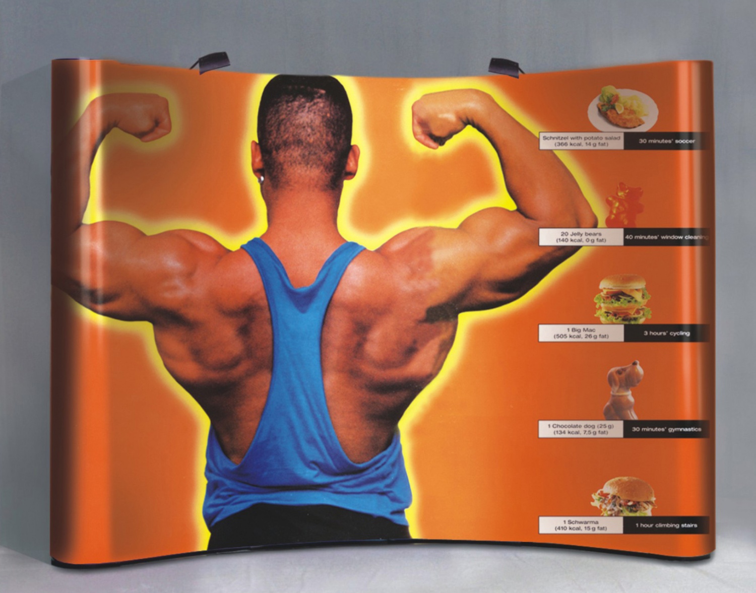 Pop up zaobljeni zid za grafike velikih dimenzija koje se jednostavno postavljaju uz pomoć magnetnih traka. Dolazi u torbi sa kotačićima za jednostavniji transport, rasvjetom, magnetima i materijalom koji se može kaširati, obrezati te postaviti uz pomoć magneta. Za kasnije izmjene vizuala se preporučuju poliesterski debeli filmovi koje nije potrebno kaširati. Za dimenzije konstrukcije i vizuala molimo da nas kontaktirate.