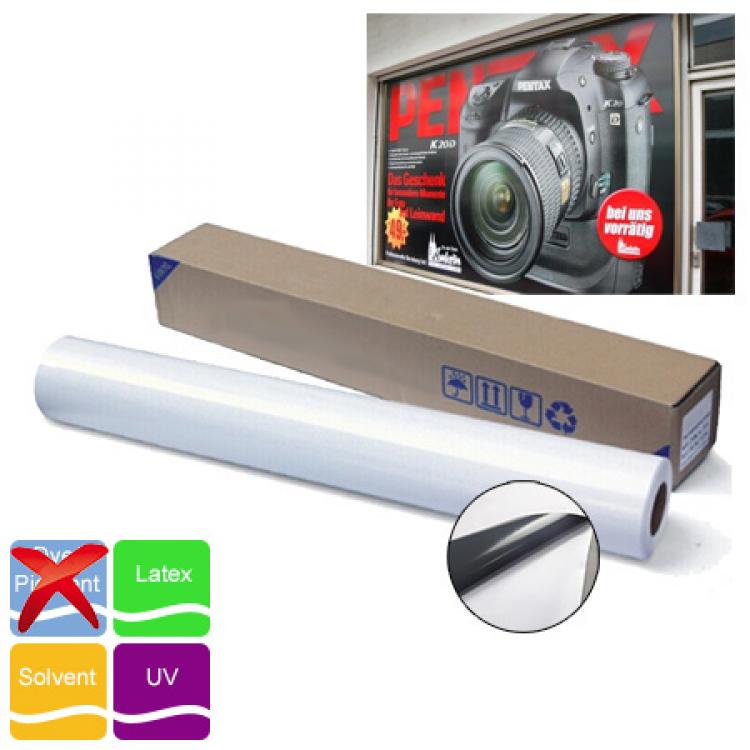 Bijela monomerna sjajna folija sa sivim ili crnim solventnim permanentnim ljepilom za svakodnevne aplikacije na ravne površine. Kompatibilnost sa Eco solvent/solvent, UV i Latex bojama